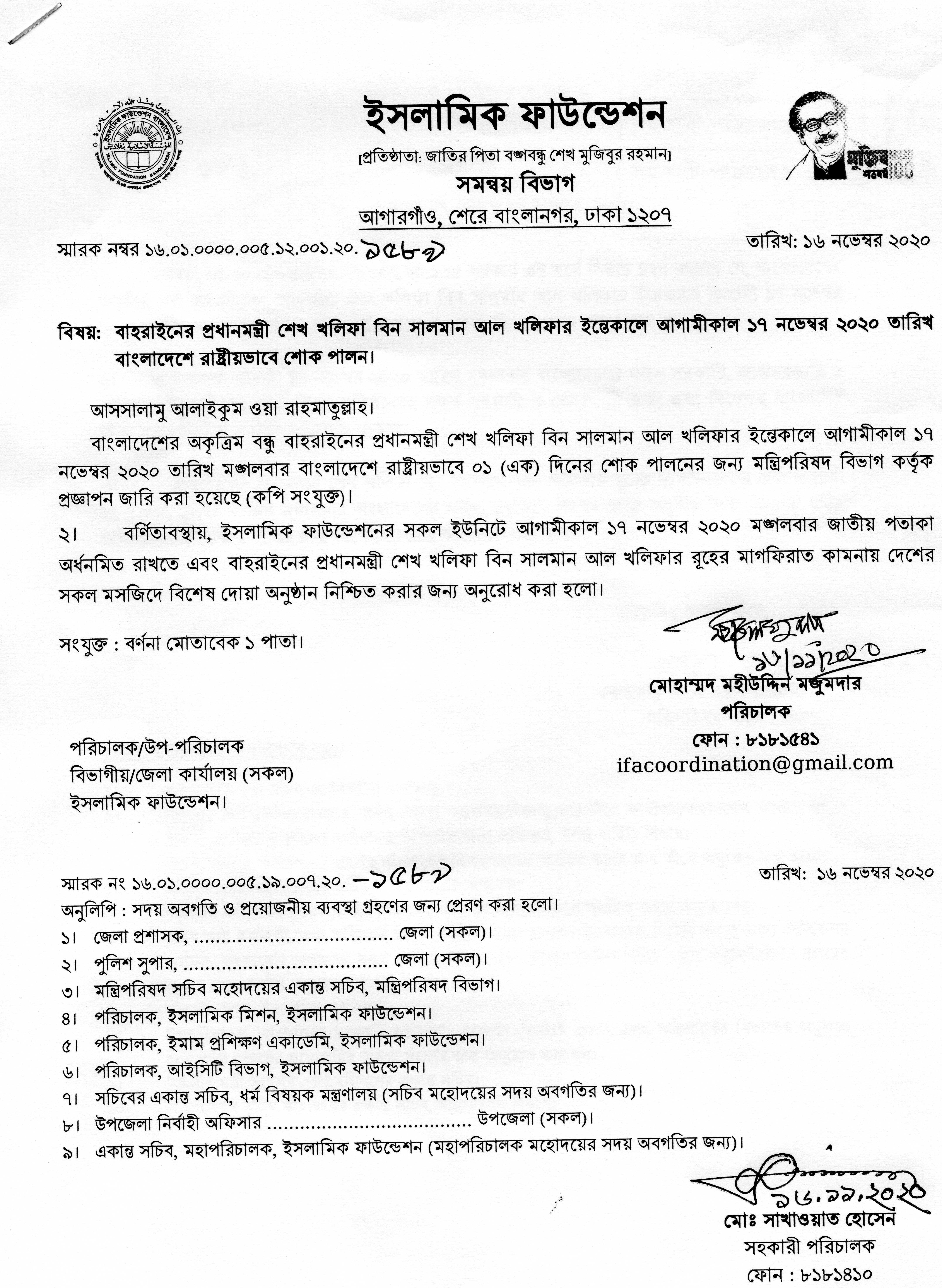 বাহরাইনের প্রধানমন্ত্রী শেখ খলিফা বিন সালমান আল খলিফার ইন্তেকালে আগামীকাল ১৭ নভেম্বর ২০২০ তারিখ বাংলাদেশে রাষ্ট্রীয়ভাবে শোক পালন